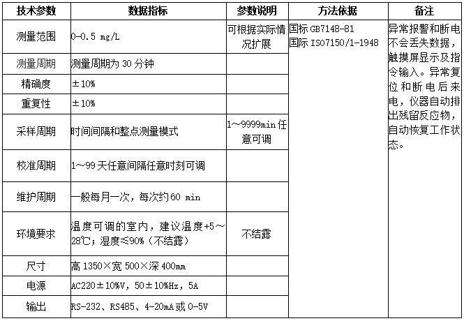 辰裕信氨氮在線分析儀工作原理:氨氮的比色法一般分納氏試劑比色法(GB7479-87)和水楊酸比色法(國標GB7148-81及國際ISO7150/1-1948)。將被分析的樣品和逐出劑在蒸餾器中混合,將樣品中的NH4+離子轉化成氨氣(NH3)。從被分析樣品中釋放的氨氣轉移到測量池中,重新溶解在指示劑中,這將引起指示劑顏色改變,然后用滴定劑進行滴定指示劑,即可獲得NH3-N的濃度。