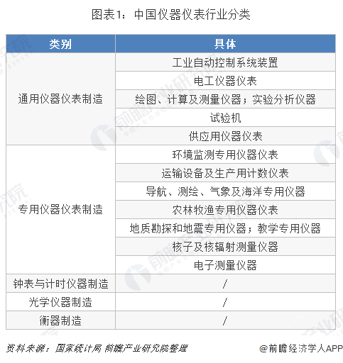 儀器儀表應用領域廣泛,覆蓋了工業、農業、交通、科技、環保、國防、文教衛生、人民生活等各方面,在國民經濟建設各行各業的運行過程中承擔著把關者和指導者的任務。根據《國民經濟行業分類》(GB/T4754-2017),儀器儀表制造行業可以分為通用儀表儀器制造、專用儀器儀表制造、鐘表與計時儀器制造、光學儀器制造和衡器制造。