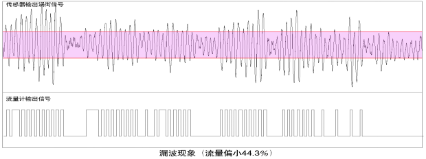 下面這兩張圖就是渦街漏波的原因,因?yàn)闇u街越強(qiáng)的時(shí)候越不穩(wěn)定,不穩(wěn)定就是信號(hào)幅度大大小小,小到有些信號(hào)無法被觸發(fā)器識(shí)別。通過把頻率信號(hào)變成方波以后,可以數(shù)出漩渦個(gè)數(shù),然而跟真正的渦街個(gè)數(shù)相比,少了44.3%。
