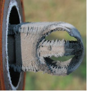 流量小的時(shí)候蠻好的,流量大的時(shí)候誤差非常大,大到負(fù)百分之幾十。因?yàn)闇u街他有個(gè)特有度現(xiàn)象,當(dāng)流量大于它的測(cè)量范圍的時(shí)候,真正的測(cè)量能力,渦街會(huì)出現(xiàn)倒走現(xiàn)象,就是流量越大指示越小,這也是渦街特有的漏波現(xiàn)象。還有更嚴(yán)重的情況,就是發(fā)生體或者傳感器斷裂,高速砸向下游。如果下游是非常昂貴的設(shè)備,那這個(gè)禍就惹的大了,這種現(xiàn)象的后果非常嚴(yán)重,我們得想盡辦法去避免這種現(xiàn)象的發(fā)生。