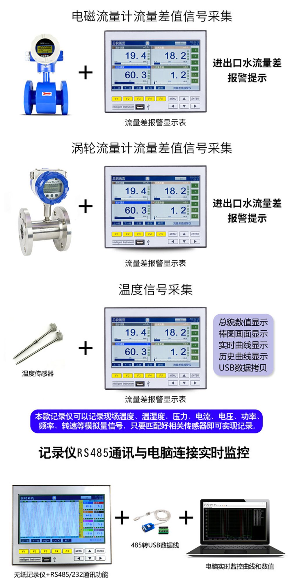 我司通過編程對中頻爐水溫、水壓及流量進行實時監測。實現溫度、壓力、流量的實時顯示。也可工控機與PLC之間進行通訊,實時采集現場的溫度和壓力值,在上位機圖型上進行顯示,溫度、壓力超限時有實時報警功能。也可以對各閥門進行控制。計算機系統監測可對中頻爐水溫、水壓、流量進行實時監測,應用較靈活,可以根據客戶具體要求編程實現,既有對水溫、水壓顯示報警功能,還可以對相應的閥門進行控制。當顯示溫度是超過上限設定值50¨C時產生的報警顯示。計算機系統監測能夠對本地和遠傳實行監測和控制,通訊功能較強,可以實現集中監控,控制和監測精度較高,并且及時準確。采用此方法監測中頻爐冷卻水的水溫、水是較高檔次的設計方案。整個硬件價格較高,使用方便、安傘可靠,技術含量較高。